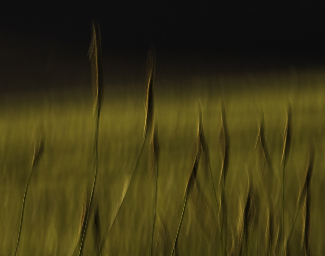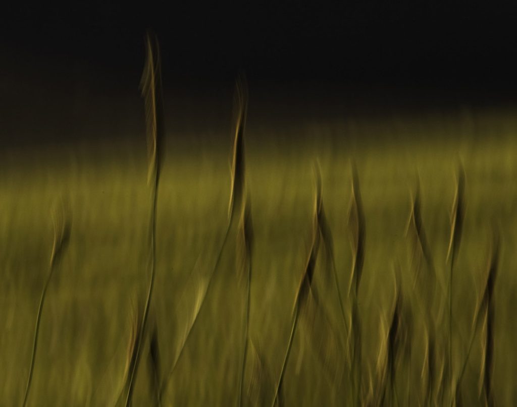 This photograph tells the quiet story of a moment suspended between light and shadow. The blurred, gently swaying forms of tall grasses suggest a soft breeze moving through a field—an unseen force shaping the scene with rhythm and grace. The warm, muted light gives the grasses a golden glow, while the deep darkness above creates a sense of calm, protection, or the approaching end of day.